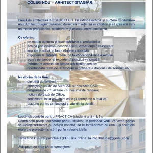 CĂUTĂM:           COLEG NOU – ARHITECT STAGIAR;       Biroul de arhitectură 3F STUDIO s.r.l. își extinde echipa și suntem în căutarea un...