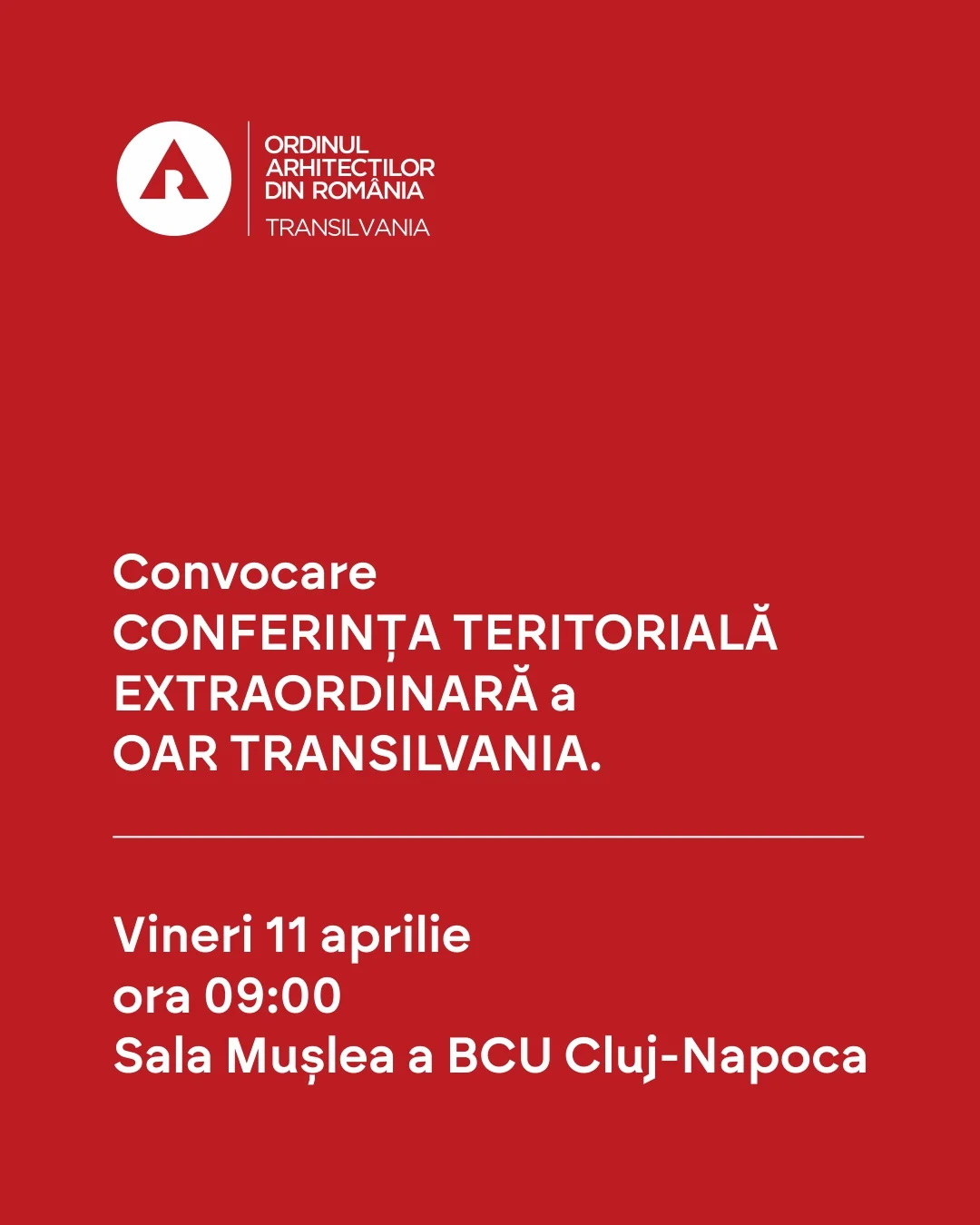 Azi 28 Martie ora 09:00 filiala Transilvania a organizat Conferința Extraordinară a filialei la Sala Mușlea a Bibliotecii Centrale Universitare în Cluj-Napoca, conferință la care ați fost invitați să participați pentru a delegarea membrilor reprezentanți la Conferința Extraordinară Națională din București 14-15 iunie a.c.