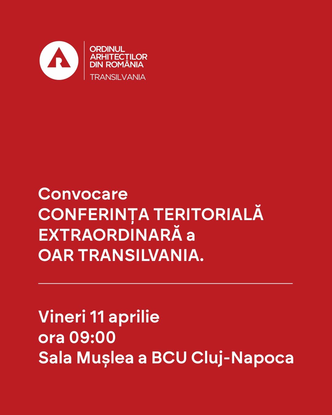Având în vedere faptul că filiala nu a întrunit cvorumul de participare (jumătate plus unu din numărul total al membrilor cu drept de vot), Consiliul Teritorial convoacă o a 2-a conferință pe data de 11 Aprilie la ora 09:00 la aceaași sală Mușlea a BCU Cluj-Napoca, în Piața Lucian Blaga în prezența și a domnului președinte OAR, arh. Ștefan Bâlici