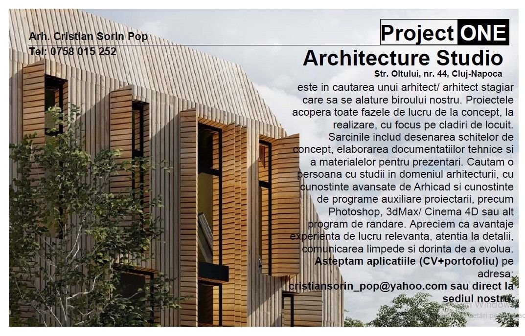 “ Project One Architecture Studio este in cautarea unui arhictect/arhitect stagiar care sa se alature biroului nostru. Proiectele acopera toate fazele de lucru de la concept, la realizare, cu focus pe cladiri de locuit. Sarcinile includ desenarea schitelor de concept, elaborarea documentatiilor tehnice si a materialelor pentru prezentari. Cautam o persoana cu studii in domeniul arhitecturii, cu cunostinte avansate de ArhiCad si cunostinte de programe auxiliare, precum Photoshop, 3dMax/Cinema 4D sau alt program de randare. Apreciem ca avantaje experienta de lucru relevanta, atentia la detalii, comunicarea limpede si dorinta de a evolua. Asteptam aplicatiile (CV+portofoliu) la adresa de e-mail: Această adresă de email este protejată contra spambots. Trebuie să activați JavaScript pentru a o vedea. sau la sediul nostru: Mun. Cluj Napoca, str. Oltului, nr. 44, ap 1, tel. 0758015252.”