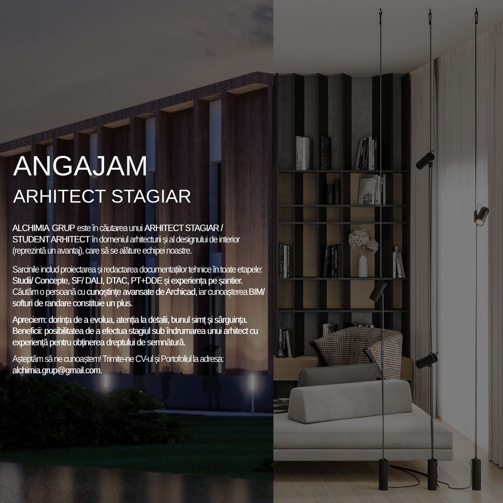 ALCHIMIA GRUP este în căutarea unui ARHITECT STAGIAR / STUDENT ARHITECT în domeniul arhitecturii și al designului de interior (reprezintă un avantaj), care să se alăture echipei noastre.