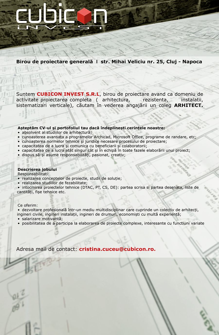 Suntem CUBICON INVEST S.R.L, birou de proiectare având ca domeniu de activitate proiectarea completă (arhitectura, rezistență, instalații, sistematizări verticale), căutam în vederea angajării un coleg ARHITECT.