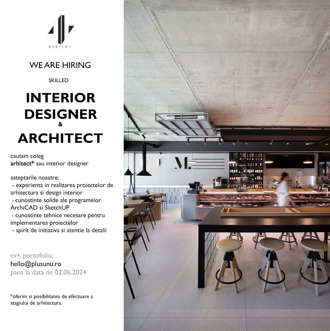 Daca doresti sa contribui la proiecte de design interior si de arhitectura si vrei sa inveti mai multe in acest sens, si sa ne ajuti si pe noi crestem, te asteptam alaturi de noi. Suntem un cadru placut de lucru, cu relativ putina presiune si dornic de mai mult de fiecare data. Daca te consideri potrivit asteptam cu interes un CV si un Portofoliu pe adresa de mail Această adresă de email este protejată contra spambots. Trebuie să activați JavaScript pentru a o vedea. pana la data de 02.06.2024.