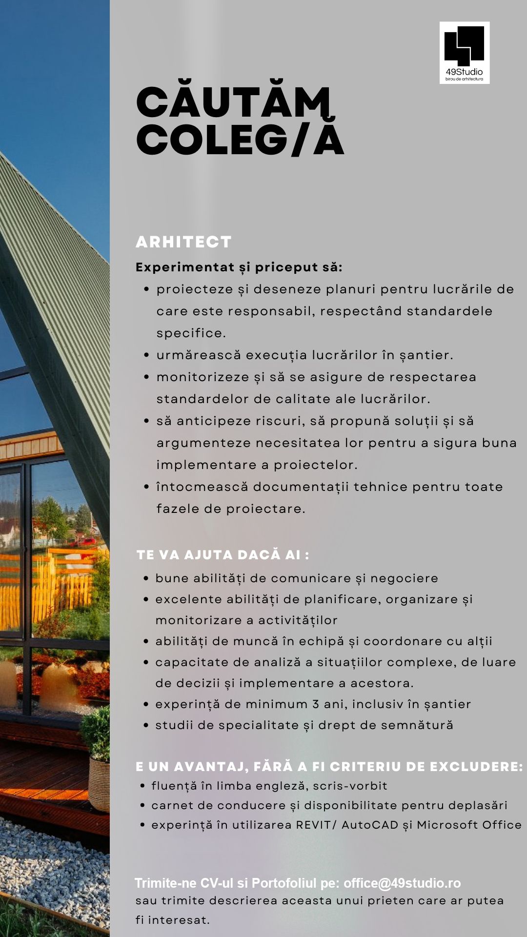 Biroul de arhitectura 49Studio, cu sediul în Cluj-Napoca, cauta coleg arhitect pentru angajare pe perioada nedeterminata.