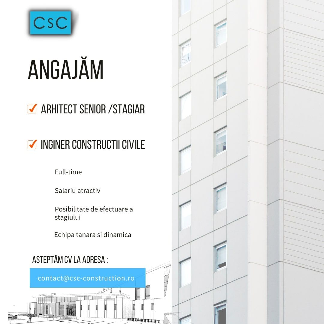 Compania noastră caută un Arhitect talentat și creativ pentru a se alătura echipei noastre din domeniul construcțiilor. Dacă ai o pasiune pentru arhitectura și experiență în proiectarea clădirilor, această poziție ar putea fi potrivită pentru tine.
